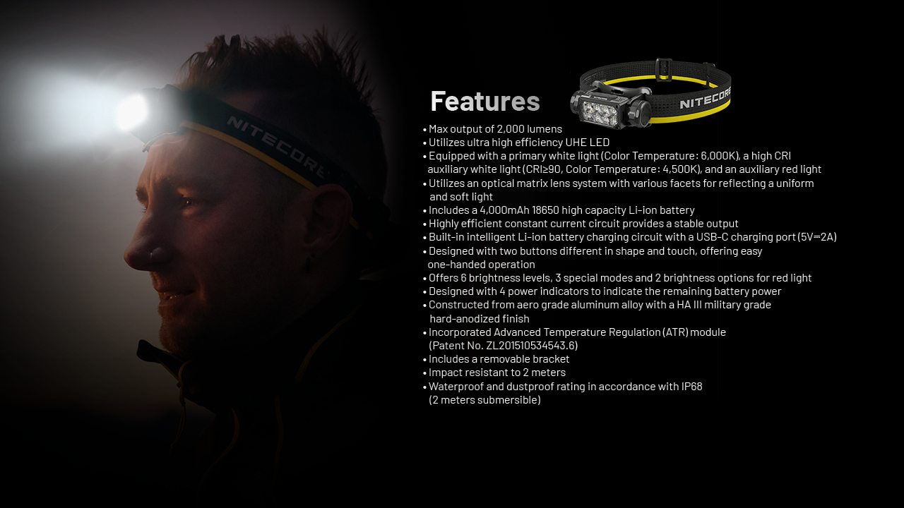 NITECORE HC65 UHE er bygget for å tåle tøffe forhold. Den er laget av anodisert aluminium av flykvalitet, noe som sikrer holdbarhet og lang levetid.